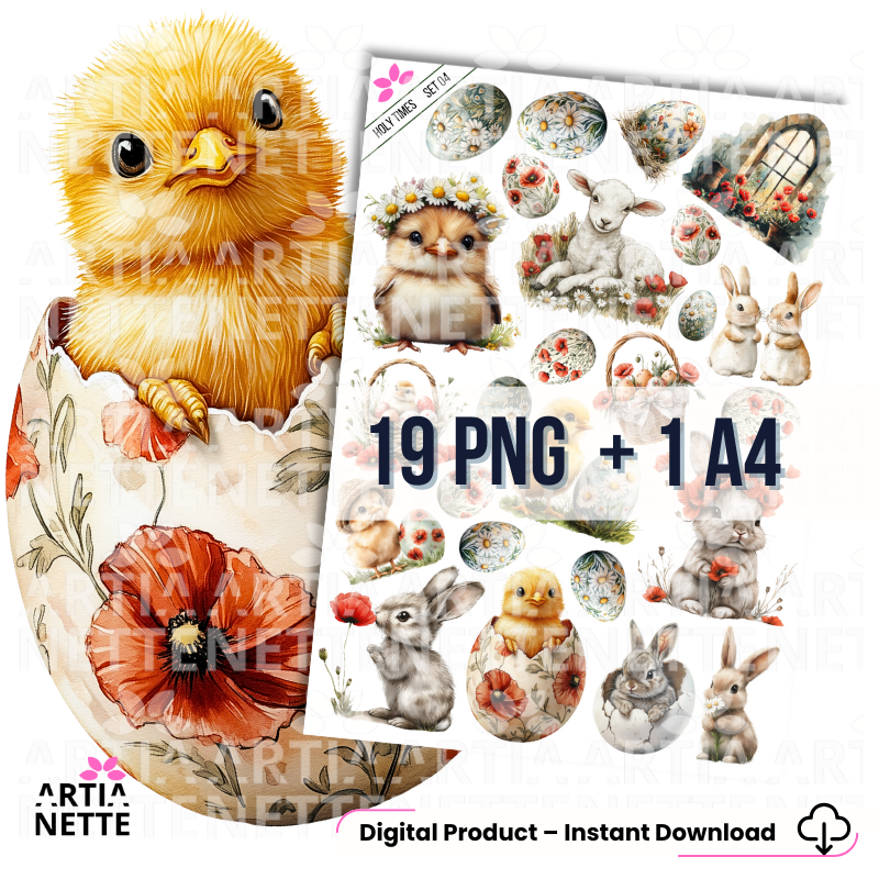 Holy Times SET 04 to zestaw pełen wdzięku, łączący symbole odradzającego się życia z delikatnymi motywami kwiatowymi. W SET 04 królują puszyste kurczaczki, wielkanocne zajączki oraz bogato zdobione pisanki, a wszystko to skąpane w radosnych barwach czerwonych maków i białych stokrotek. To idealny wybór dla twórców, którzy chcą wywołać uśmiech na twarzach obdarowanych osób.
