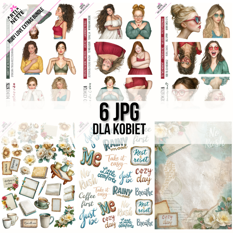 Wszystkie grafiki utrzymane są w spójnym, kobiecym klimacie, dlatego możesz budować harmonijne kompozycje bez dodatkowej obróbki.