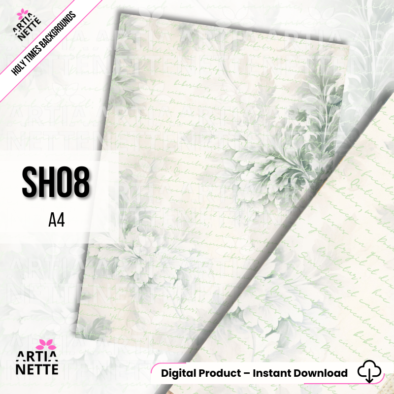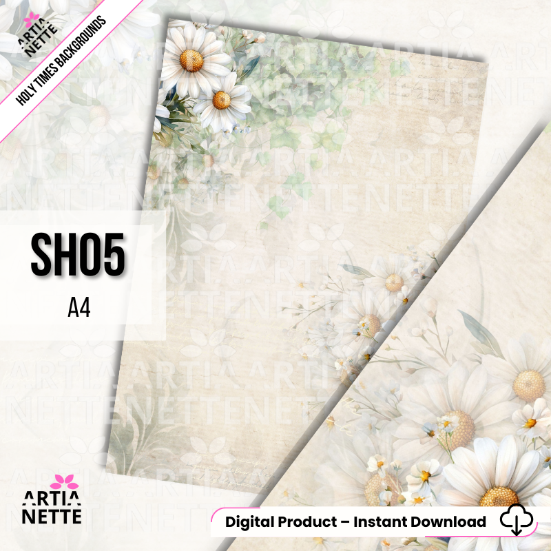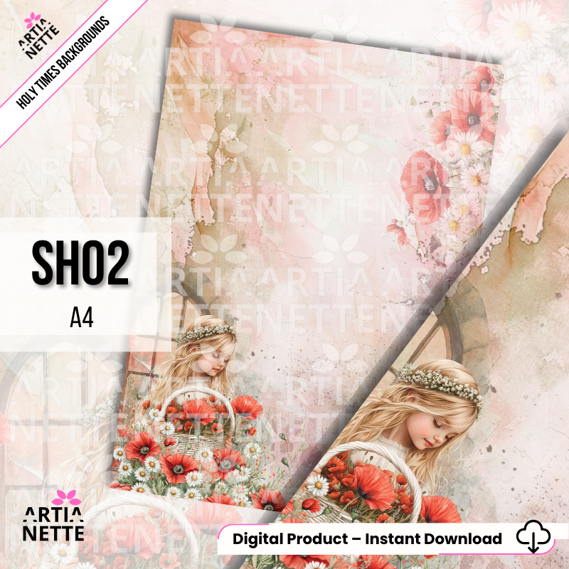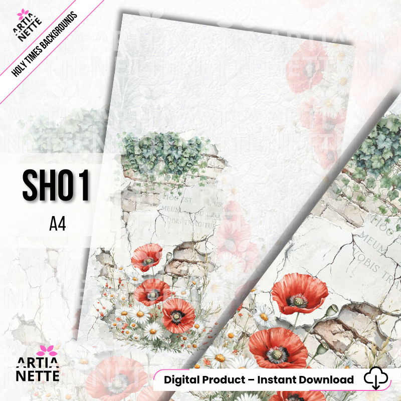 Holy times to starannie dobrany zestaw 12 teł cyfrowych w formacie A4, stworzony z myślą o projektach o charakterze uroczystym i religijnym. Kolekcja łączy w sobie delikatne motywy roślinne, takie jak maki i stokrotki, z teksturami starej cegły, akwarelowymi plamami oraz zabytkowym pismem.