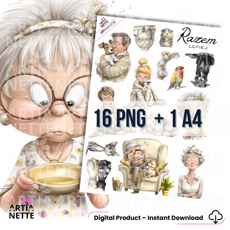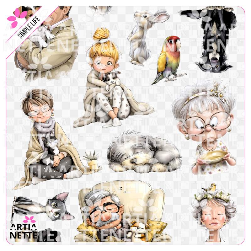 Simple Life - SET 02 to pakiet ilustracji cyfrowych, które koncentrują się na codziennych chwilach spędzanych z pupilami. Znajdziesz tu postacie starszych osób, dzieci oraz szeroki wybór zwierząt domowych, przedstawionych w ciepły i radosny sposób.
