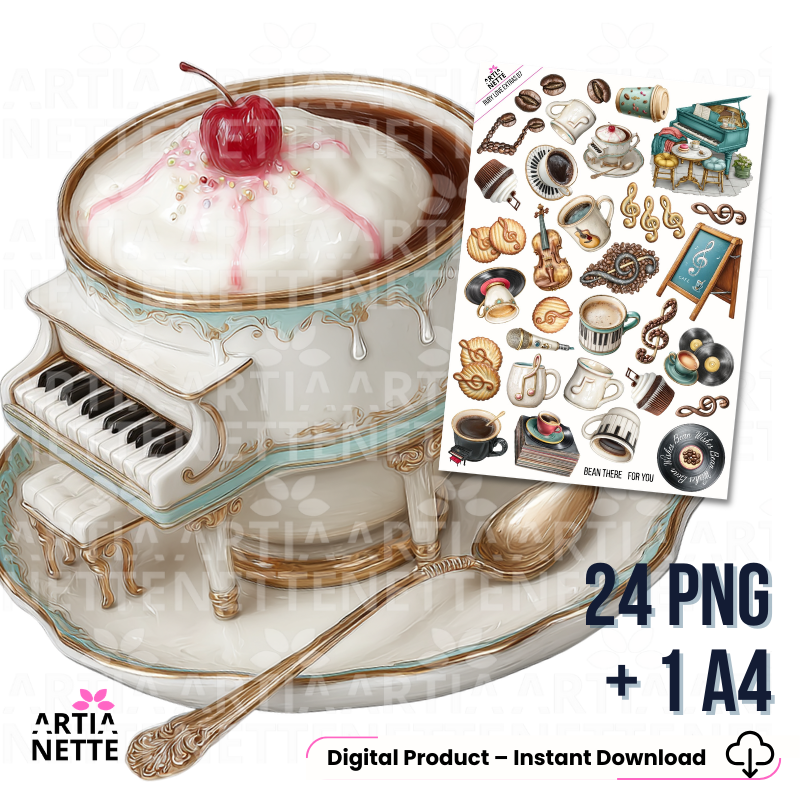 Kawa i muzyka – filiżanki, nuty i słodkości | Arkusze A4 + 24 PNG | Ruby Love Extras 07